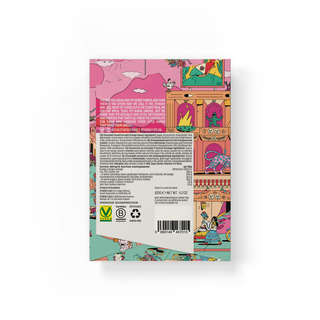 Got a thing for citrus with a side of chaos? The Otherly Orange Oatm*lk bar is a sweet little zing-fest – silky oatm*lk chocolate stirred up with a splash of orange essential oil and a whole lotta Otherly charm. It’s smooth, it’s slightly tangy, and it leaves your taste buds doing a happy little dance long after the last bite.