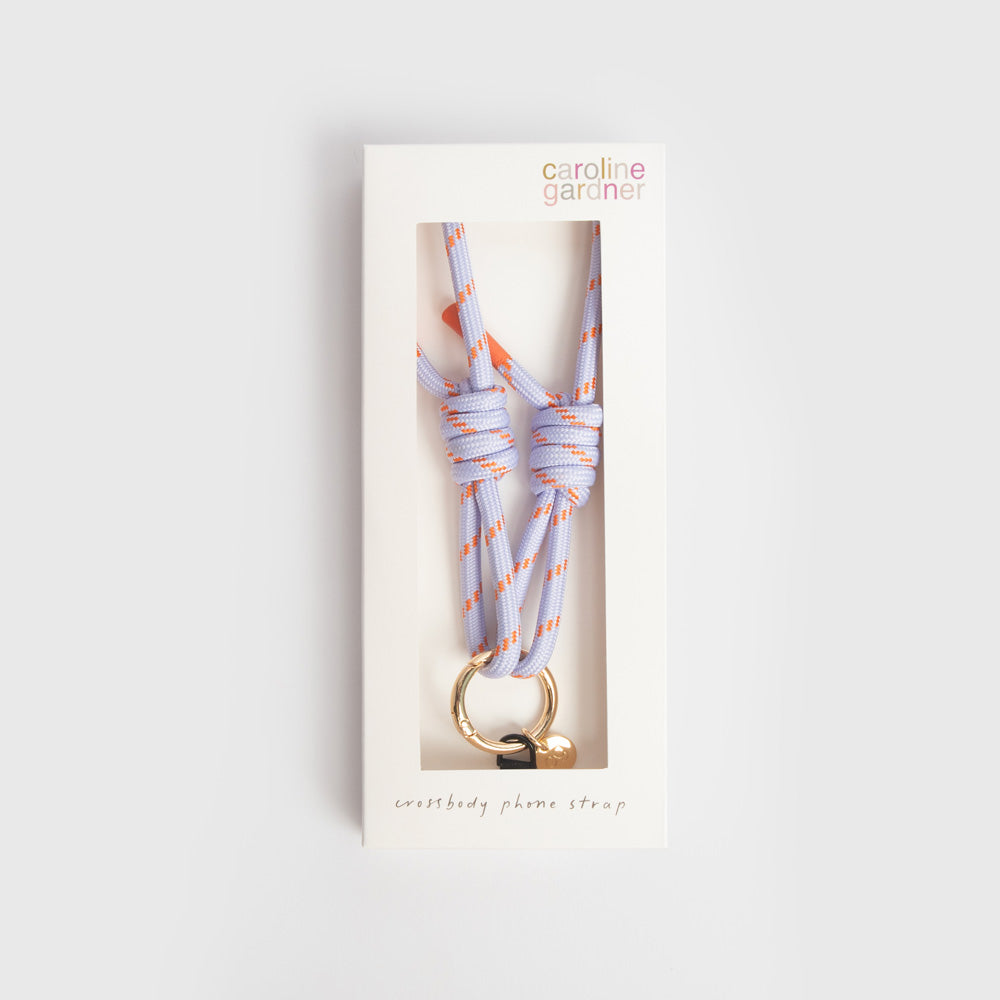 The Caroline Gardner long woven cord phone strap comes in Orange & Duck Egg, Green & Pink and Lilac & Orange. This compact strap is adjustable between 67cm and 75.5cm, and keeps your phone close at hand, featuring sturdy gold hardware to combine style with everyday ease.