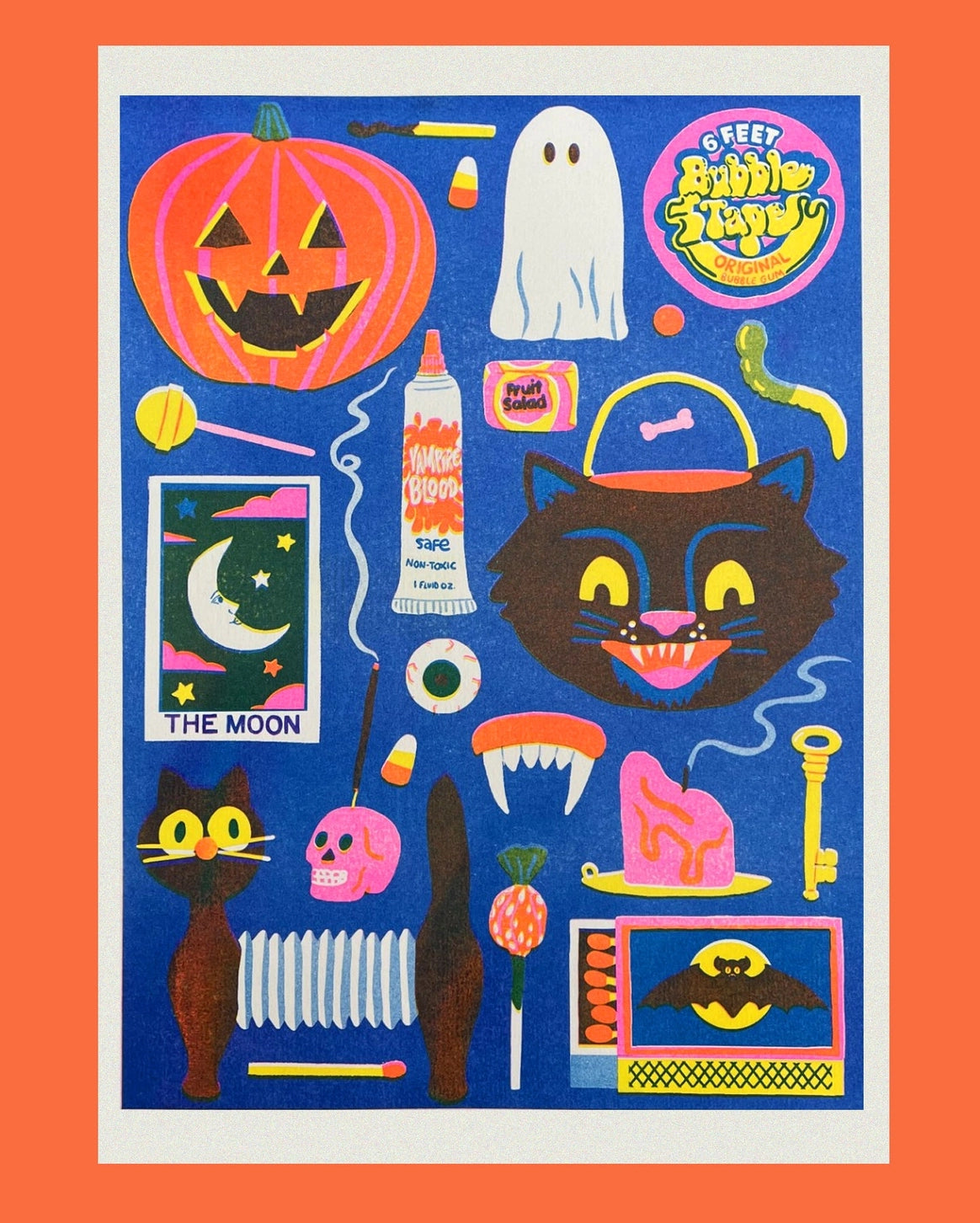 A risograph print by Naomi Wilkinson using soy based environmentally friendly inks on recycled paper stock.