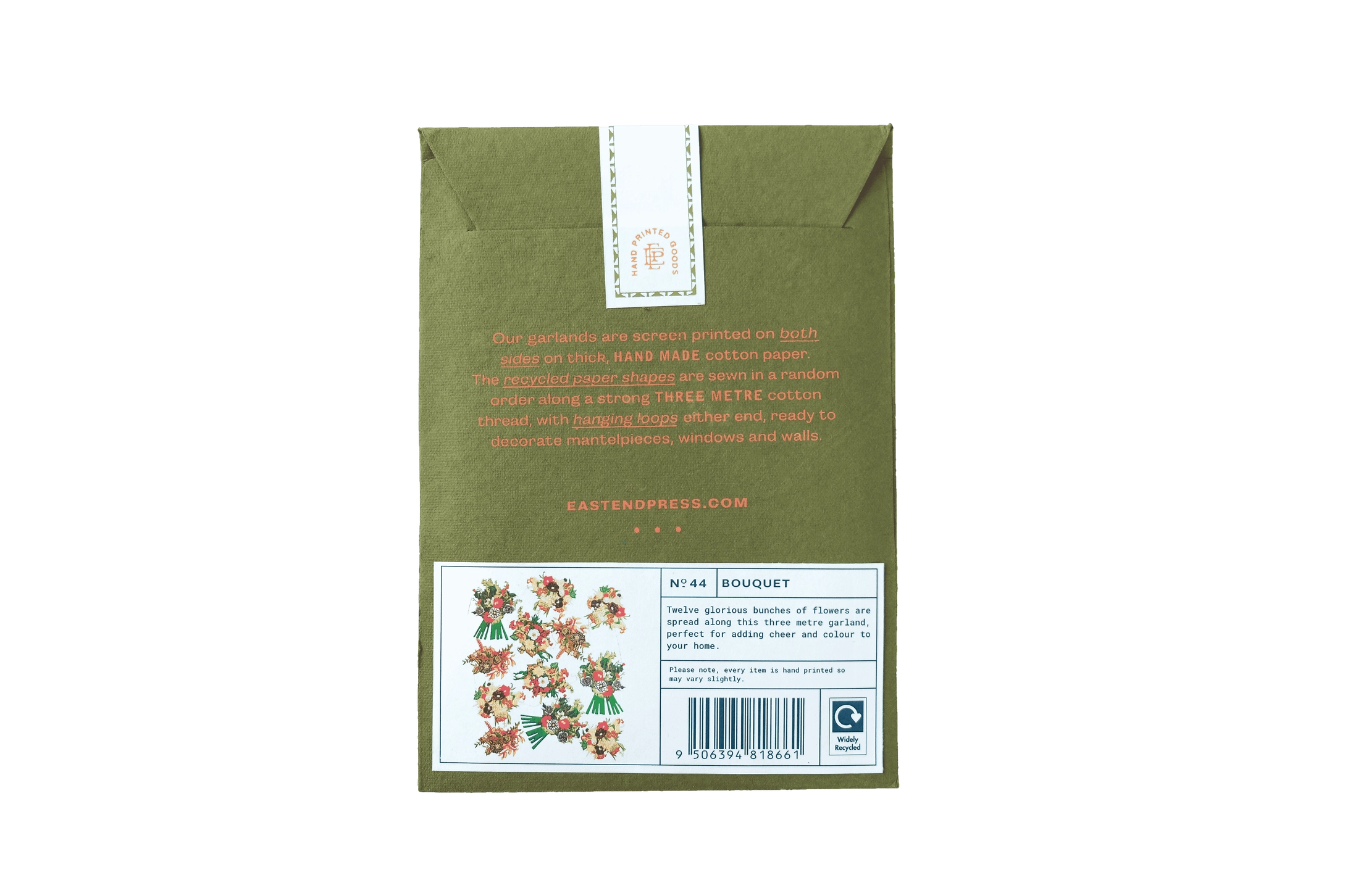Hand printed three metre long paper garland, featuring ten screen printed paper shapes of floral blooms! The garland is printed on both sides on thick, hand made cotton paper. The shapes are sewn in a random order along strong cotton thread, with hanging loops either end, meaning you can hang your garland straight away!