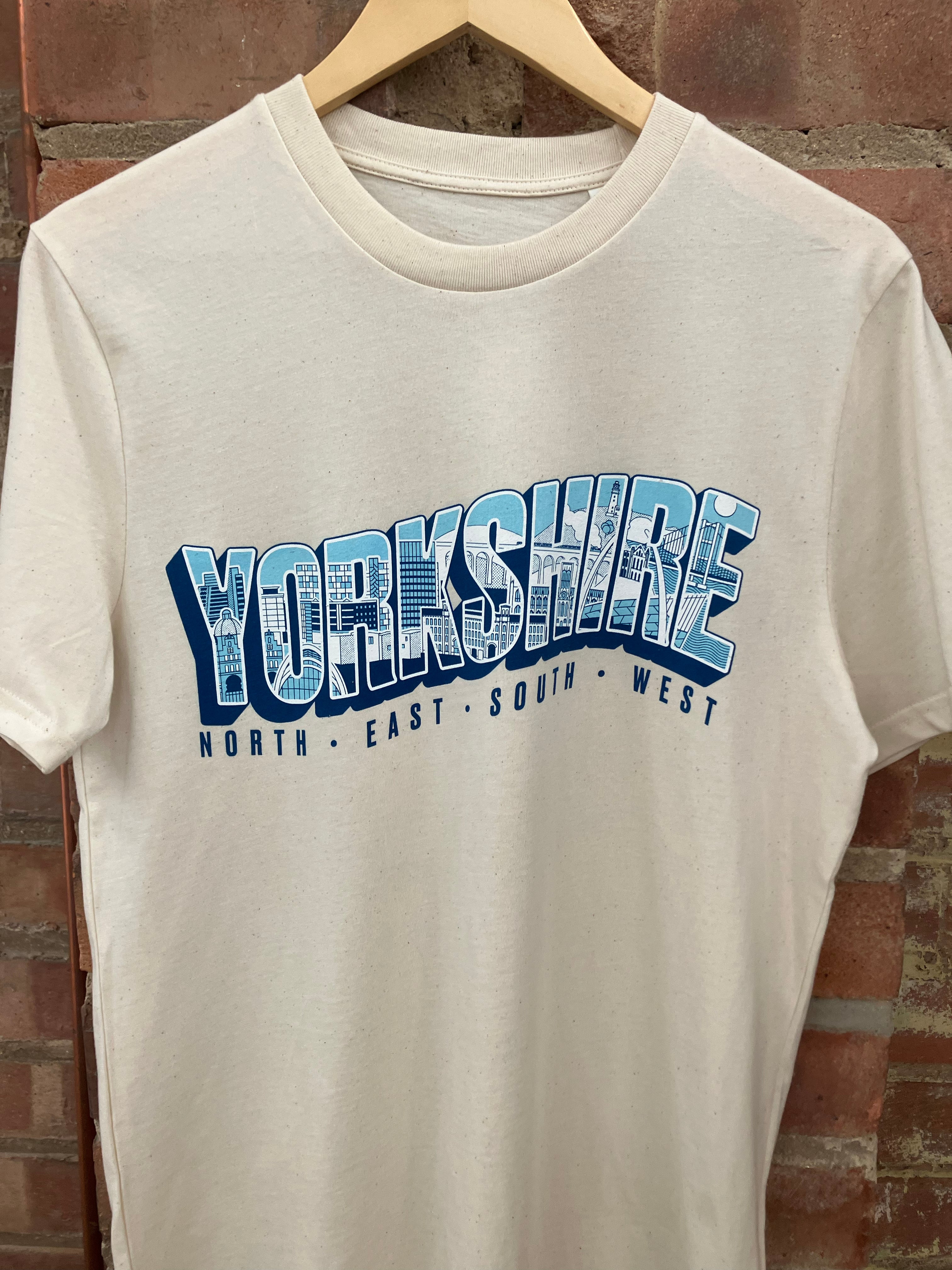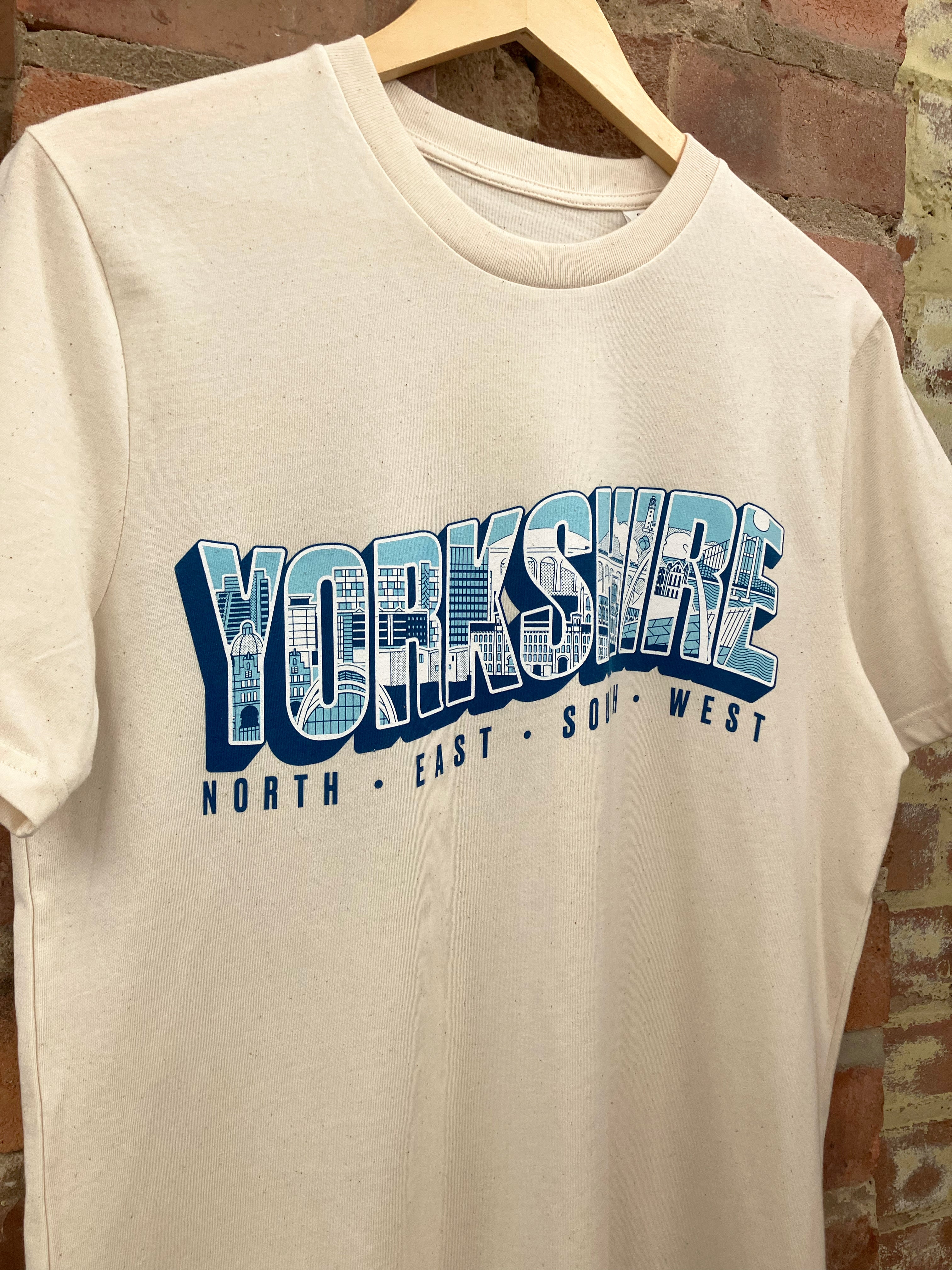 Screenprinted 100% cotton Hull T-shirt featuring Joseph Cox of Form Shop & Studio's Yorkshire text illustration inspired by vintage postcards.