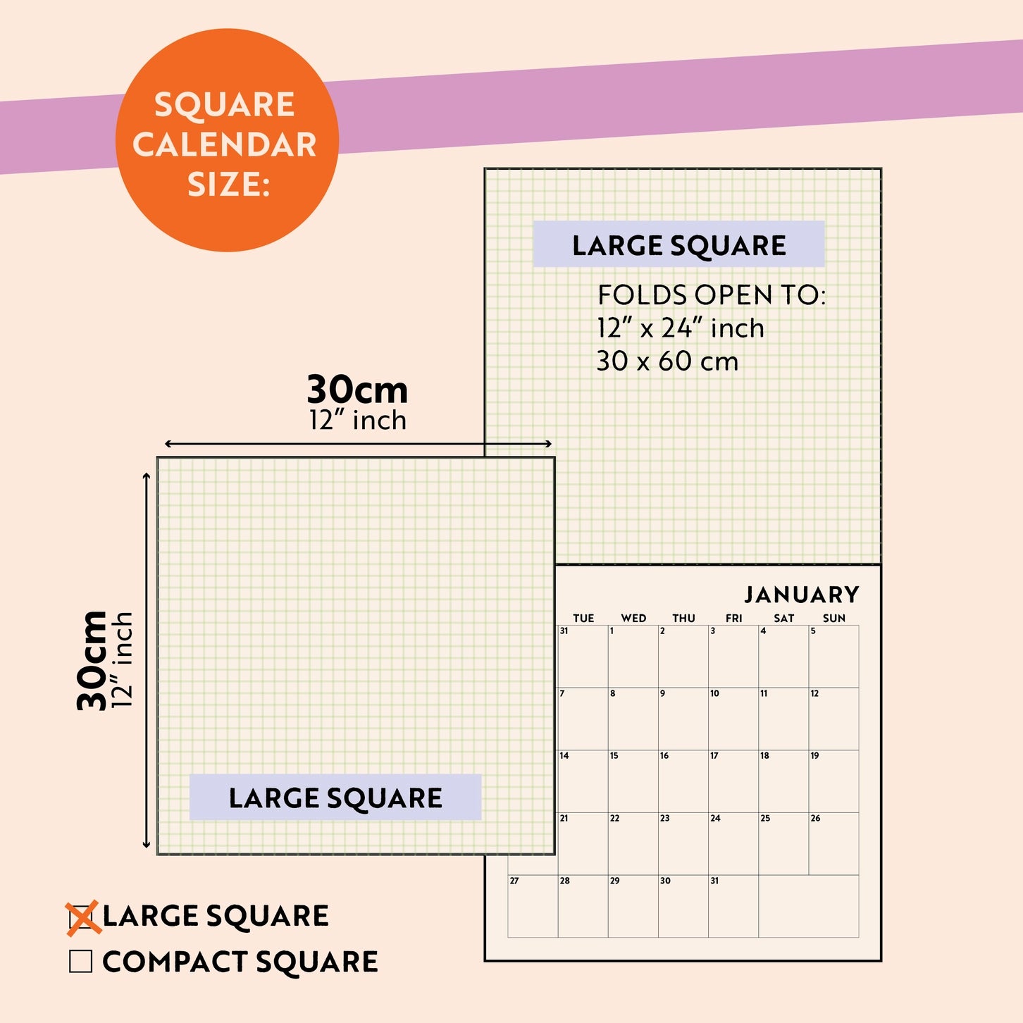 This large grid calendar runs from January to December 2026, with a Sunday-start monthly layout. Each page features whimsical nature-inspired artwork in a zingy, colourful palette. There’s space to write appointments and birthdays, with UK & US holidays, moon phases, week numbers, and a mini month preview all included.