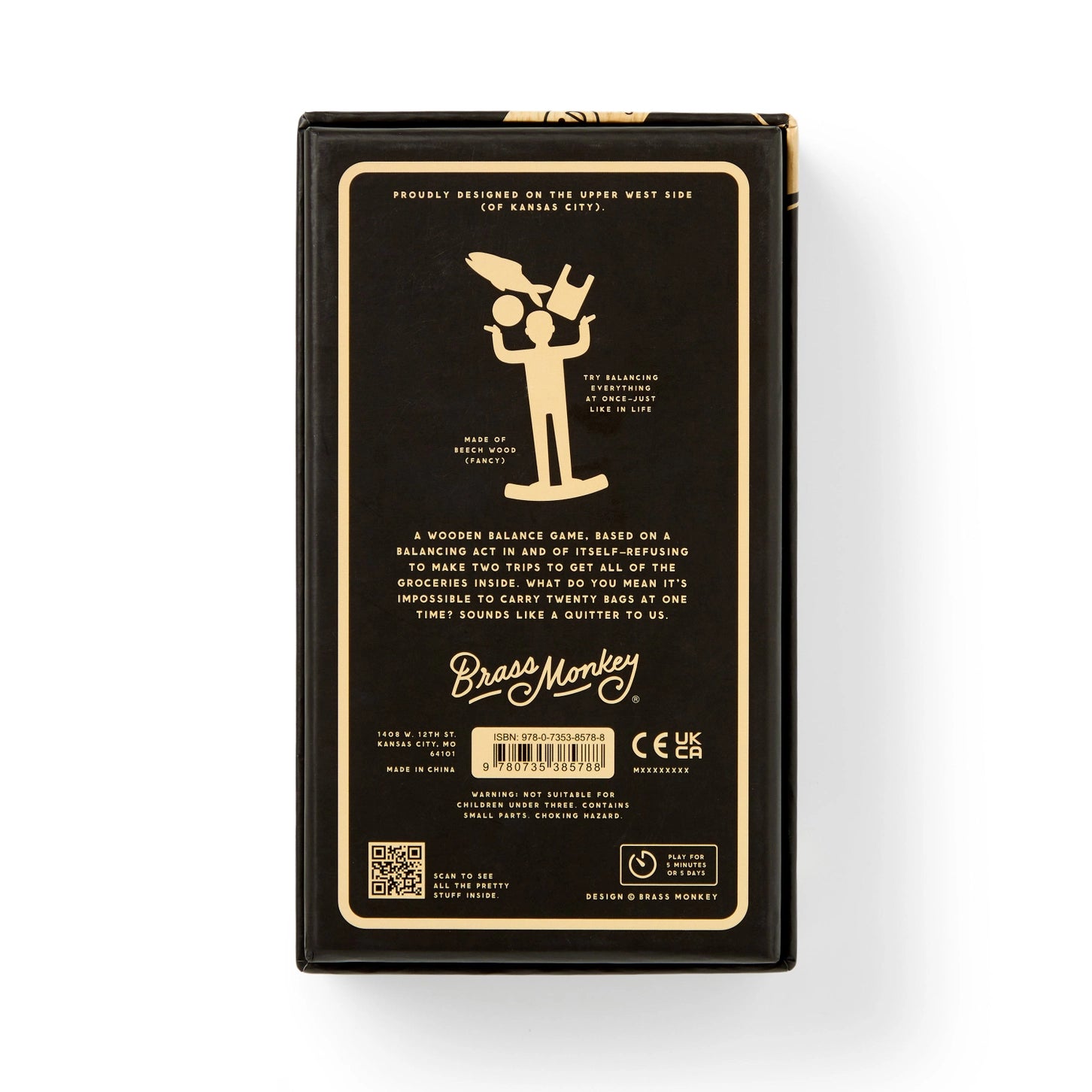 A wooden balance game, based on a balancing act in and of itself: trying to get all the groceries inside in just one trip. What do you mean it's not physically possible to carry twenty bags in at once? Players compete by trying to add increasingly ridiculous items on top of the eponymous Nick without knocking him over and dropping everything.