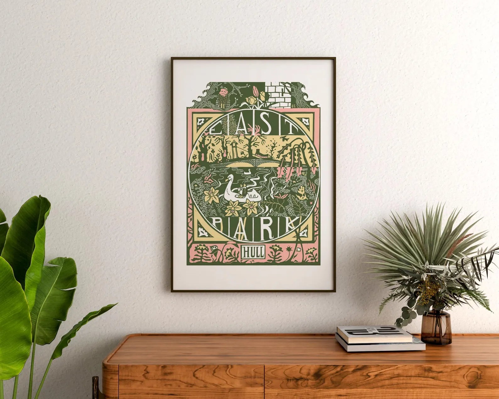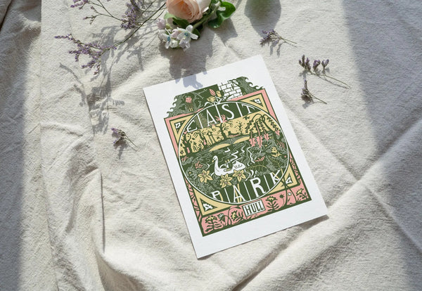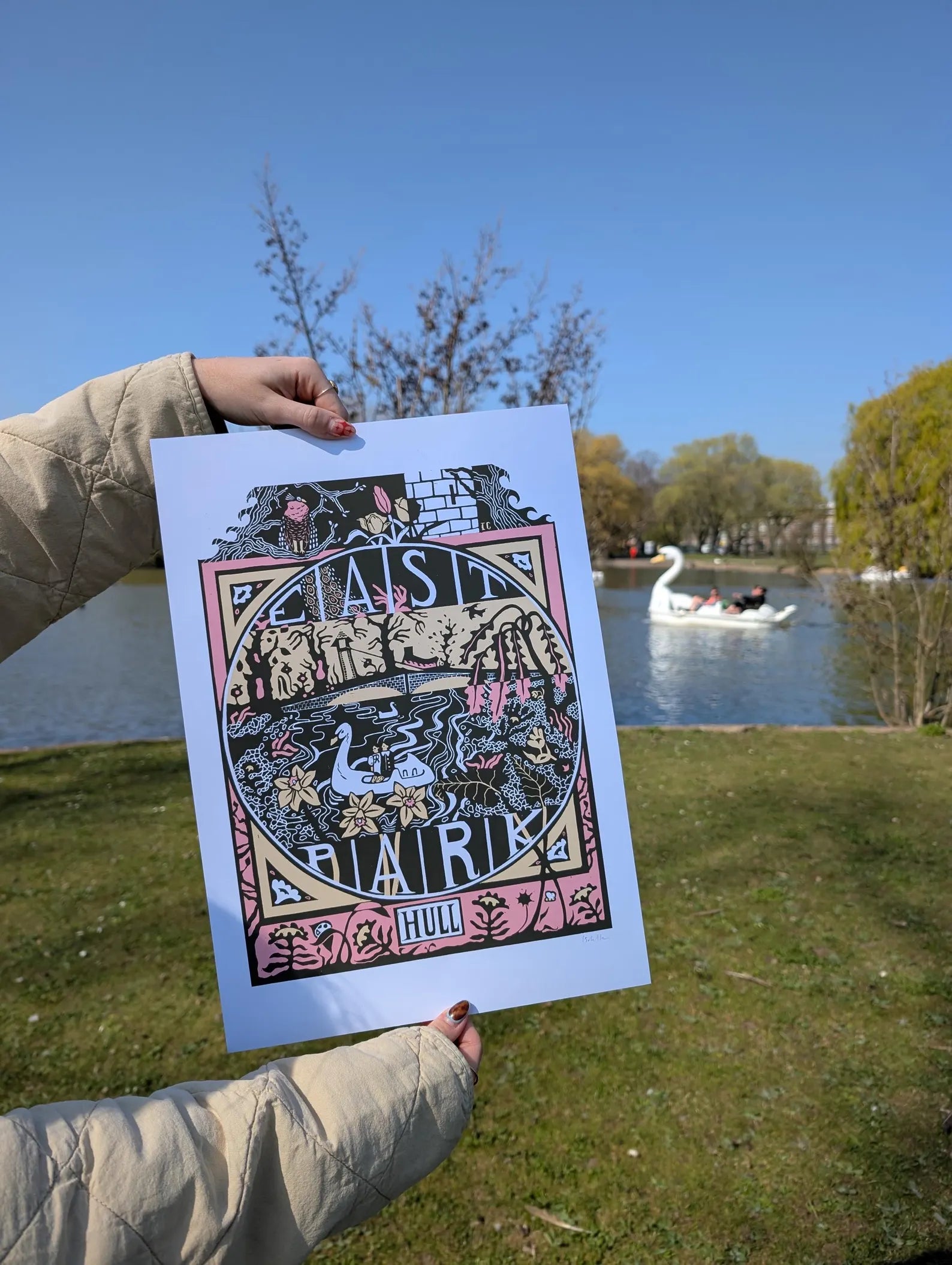 An art print from an original linocut by Isobelle Cochrane, of Hull's largest and one of the most beloved parks. It features some of the park's best attractions including the Splash Boat and swan pedalos.