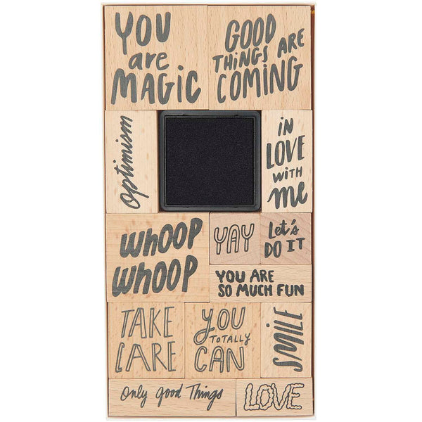 This beautifully designed You Are Magic stamp set includes 14 stamps of varying lattering and positive sayings. Perfect for decorating a diary, journal, letters or cards. This set includes a black ink pad.