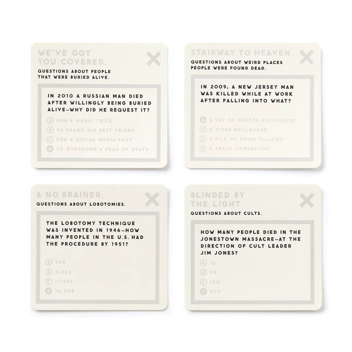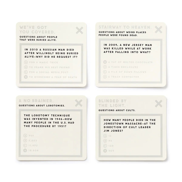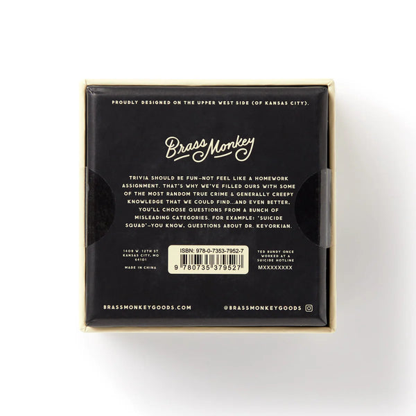 Trivia should be fun - not feel like a homework assignment. That's why this Truly Terrifying Trivia set by Brass Monkey is filled with some of the most random true crime & generally creepy knowledge they could find… and even better, you'll choose your questions from a bunch of misleading categories.
