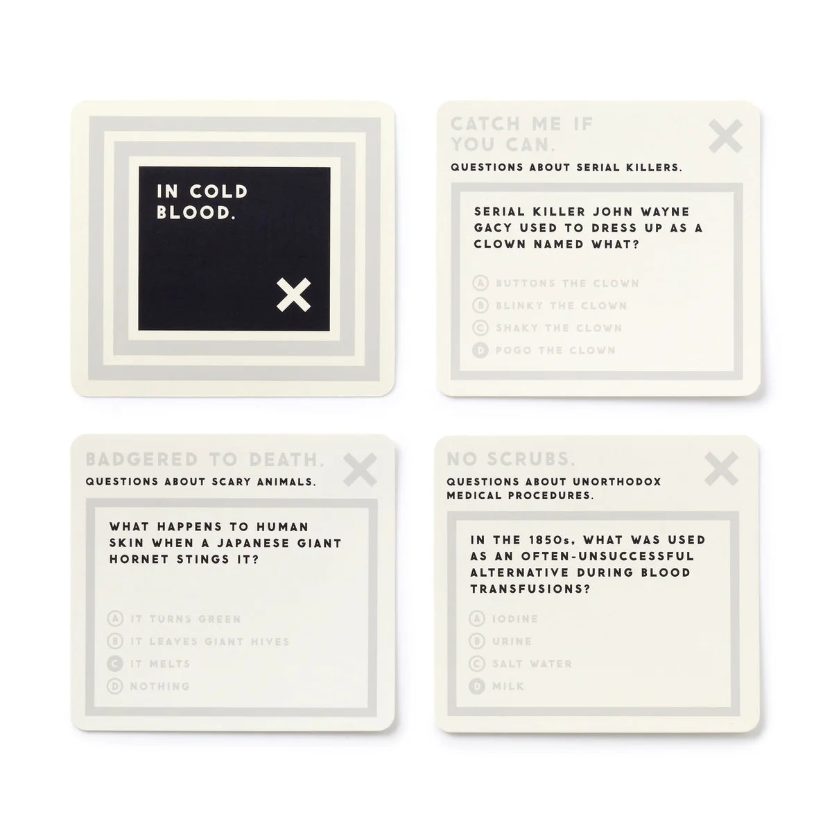 // Includes 200 unique trivia cards specifically themed around truly terrifying facts (that you'll probably regret learning).