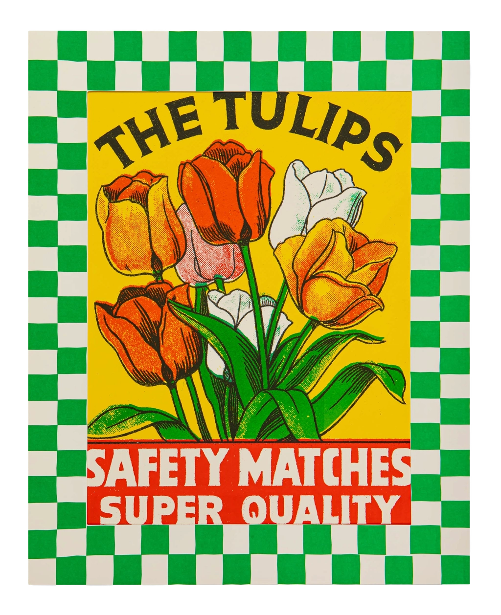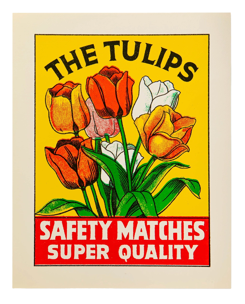 A spot colour large print with a bright yellow background, featuring a bouquet of red, orange, and white tulips with the words 'The Tulips, Safety Matches, Super Quality.' Inspired by a Finnish matchbox label.