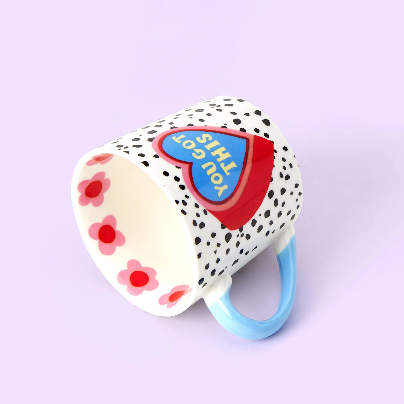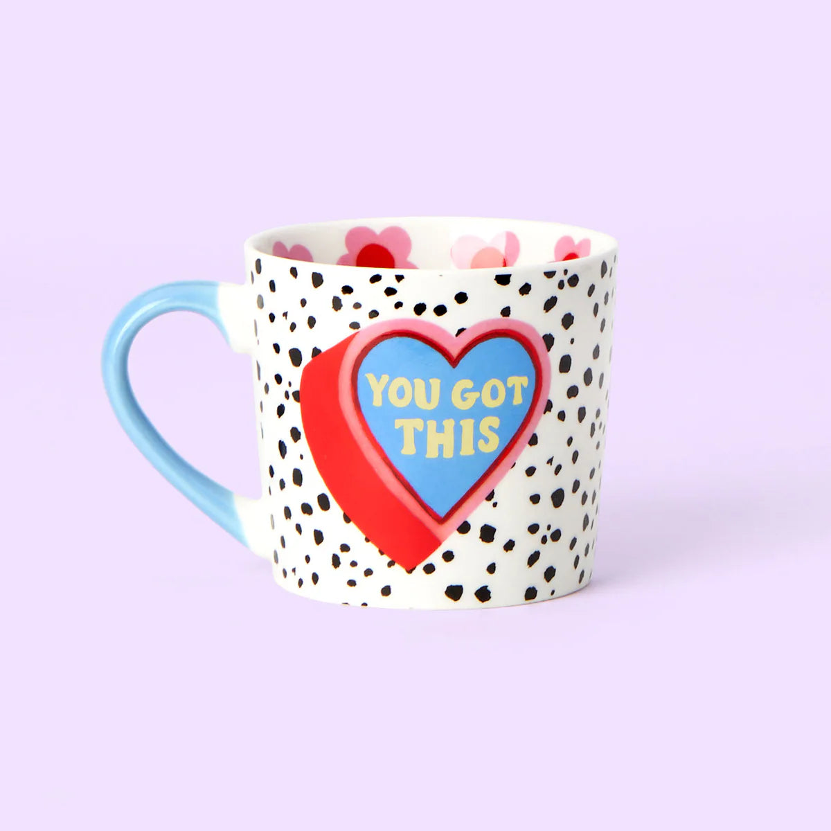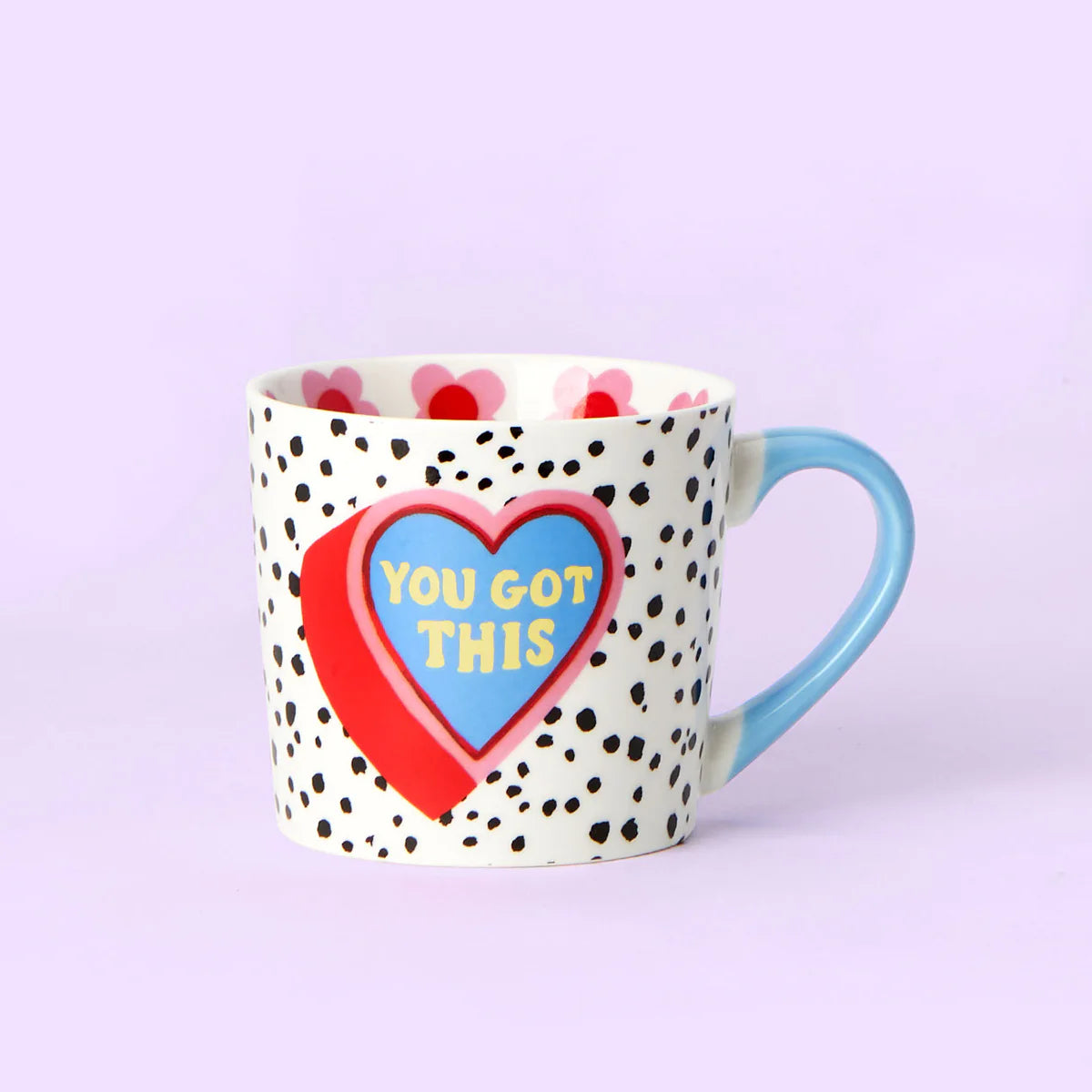 This beautiful mug will make your coffee break a little bit brighter. Its white background with black spots is vibrant and fun, while the pastel blue handle adds a touch of calm. The pink and red heart with the motivational 'you got this' message will make you smile — perfect for reminding yourself to stay strong. Cute flower detailing inside the mug completes the look. You got this!